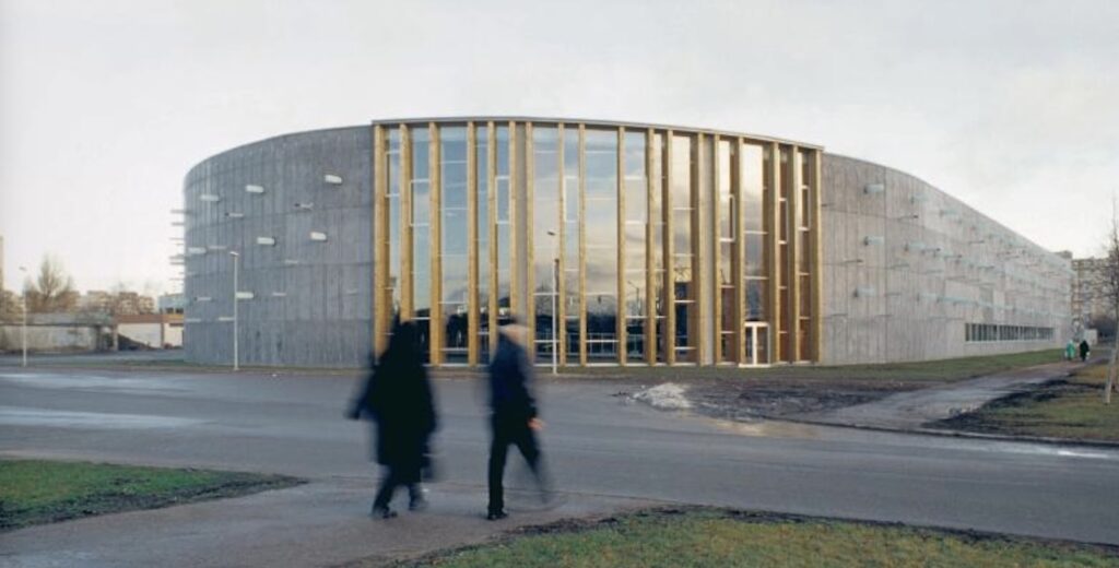 The second building Is the Estonian Vallner Lasnamäe Track and Field Center, located in the outskirts of Tallinn, where the area is filled with Soviet Era apartment blocks made of prefabricated concrete panels. I think it is interesting that the highly regulated Soviet complex is softened by the warm, rich and brown columns. Ivy will eventually cover the building, adding an even more natural ambience.
